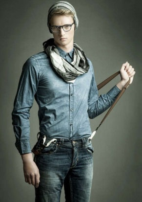 EyeglassBoy.com carries a cool update on the glasses. Shirtwise, A.P.C. makes a cool, slim fit denim shirt, as does Club Monaco and hip Parisian brand Officine Generale. For the suspender, we suggest either our classic, dark-green Forest suspender or Olive Branch, both of which come as either a clip-on or button-on. Alternatively, consider our Hide & Seek camo suspenders.