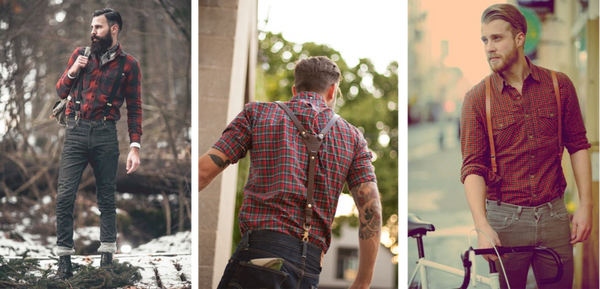 We like a simple, classic take on it: a (red) plaid shirt (bonus points if it’s flannel), faded blue jeans, and nicely worn-in hiking boots. And don’t forget the suspenders, as they’re the accessory that really completes this look: leather or brown, worn in, and with a nice mid/wide strap. Well-groomed beard optional (but highly recommended).