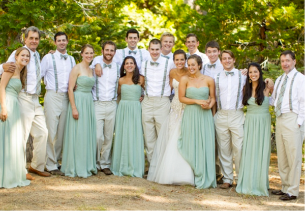 While you don’t want to match your bridesmaids and groomsmen too closely, including a small element of their dresses into your groomsmen’s outfits is a nice touch. We particularly like matching the color of the groomsmen’s suspenders to the bridesmaid’s dresses.