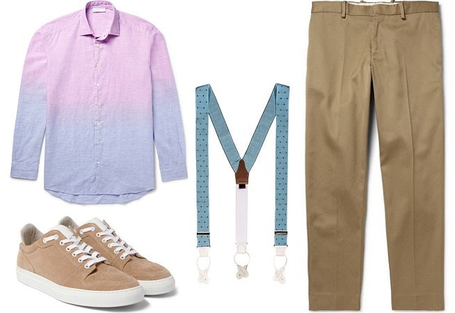 To make Yellow-Red-Blue work for your own closet but without the risk of looking like you wandered off the set of Gatsby, choose a yellow from the khaki part of that color-clan. It qualifies as a yellow, but not in a way that seems like 1925 called and wants their pants back. An on-trend ombre shirt that stylishly morphs from blue to pink takes care of the red portion, and, like for Gatsby, it’s all about a suspender in blue. So while the rich might differ from you and me, the opposite isn’t necessarily true.