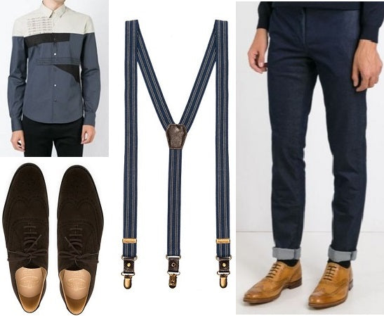 This shirt by Korean designer Wooyoungmi is a fun way to get the feel of Gekko’s blue, contrast-collar shirt, but in a more modern way. Plus it goes really well with our navy pinstriped “Scholar” suspenders! And instead of jeans, chinos in a dark denim give a dressier feel, but not too dressy. And lastly, brogues in a dark-brown suede - for two reasons: brown accessories always look great with blue and indigo, and choosing suede keeps the vibe more comfortably casual, but still smart.