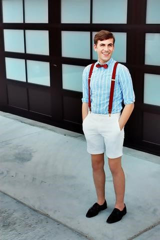 You can also add a floppy hat while you are out and about in the sun. Wearing long sleeved shirt with jeans shorts is not a hard and fast rule though, if the weather is warm pick your short-sleeved shirt and the rest of the magic will be done by your suspenders. Rock on!