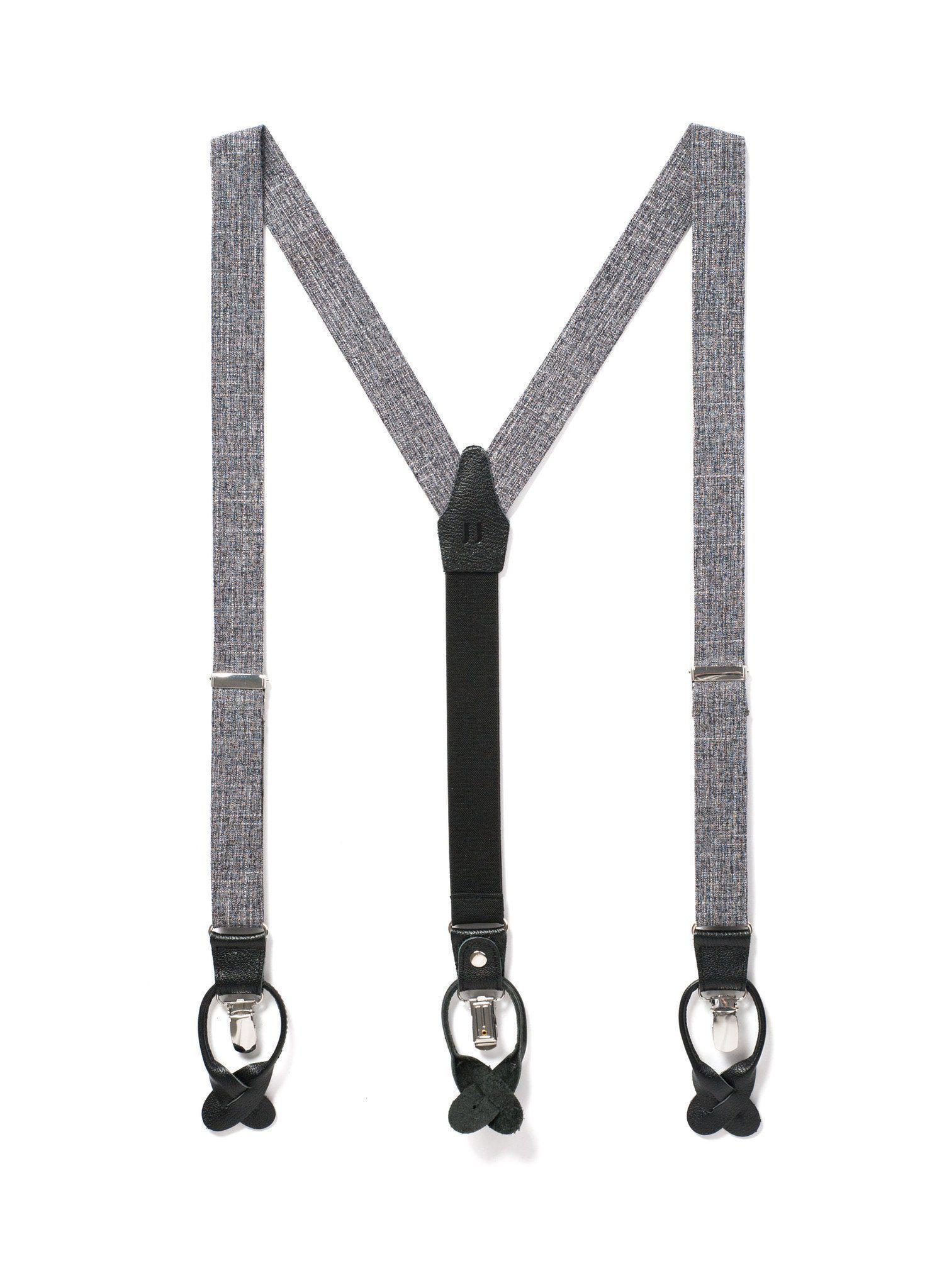 This pair is all about texture. With contrasting grey, white, and black colors, these suspenders boasting woven straps are a twist on the classic accessory. Subtle (yet durable) silvertone hardware and black, authentic full-grain details complement the intriguing texture. These look best paired with cool hues—think ocean blues and bold purples.