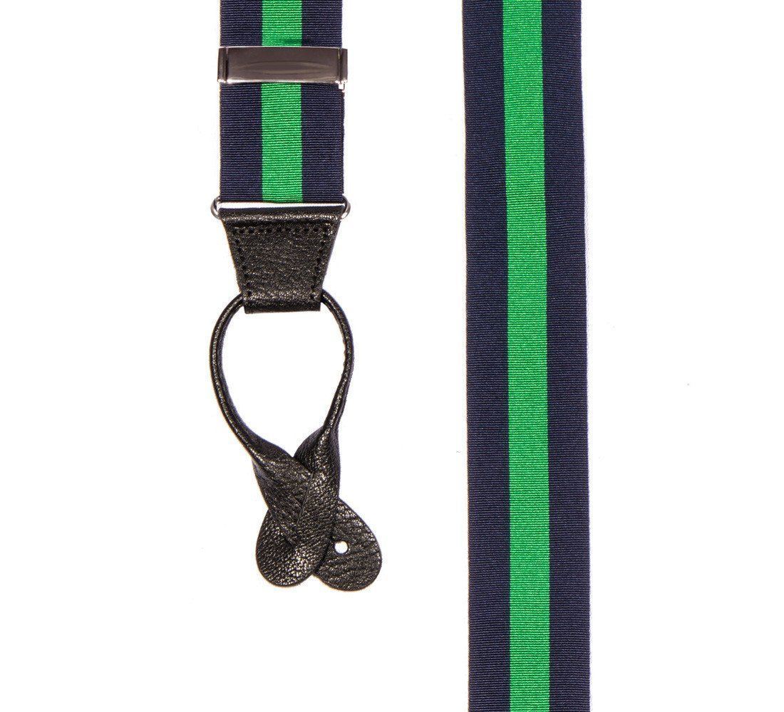 These striking navy and green striped suspenders are the perfect addition to any wardrobe, whether formal or casual. Their bold yet classic colors will brighten your look without being overwhelming. These suspenders feature black leather detailing and high quality hardware, and can be clipped on or buttoned for added versatility.