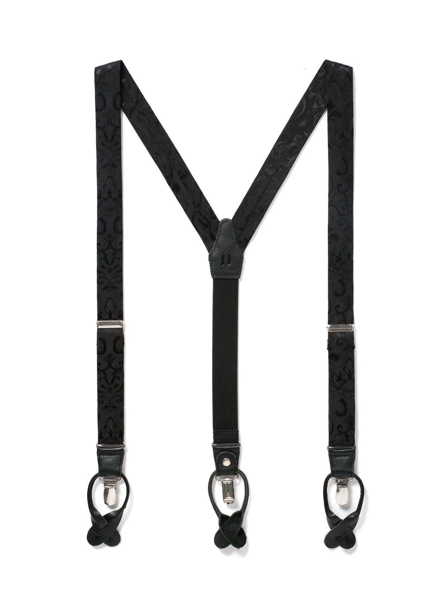 At first glance, these may look like your standard, sleek, onyx-hued suspenders—but look closer. The playful addition: paisley print. Keeping with the all-black look, we've constructed this staple with dark, full-grain leather attachments and complementary silvertone hardware. Soft blended fabrics cut at the perfect width ensures a modern look perfect for casual or formal wear. Wear this accessory with solid hues for a touch of just-right flair.