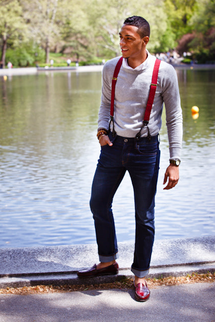 Although red suspenders tend to bring slick Wall Streetiness to mind, they actually lend themselves well to a sartorial stroll further downtown. Red is a fun fashion weapon - it’s eyecatching and bold - but there is a caveat: a little goes a loooooooooooong way. Here are some ways to do red suspenders right:
